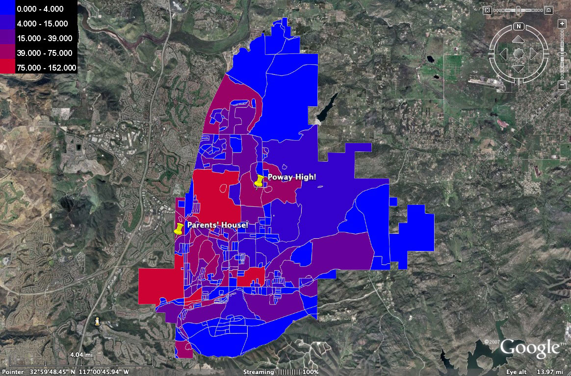 Thursday, May 3, 2007 As I predicted, now you can display population density data in Google Earth, thanks to the work of Imran Haque, a grad student at Stanford (boo!) though he was an undergrad at Cal (yay!). His program, gCensus, allows the drawing of polygons over Google Maps, which the Google Map API doesn't do well on its own. Combine that with freely available US Census data and genius happens. Do I get any credit for predicting its development? No? Ok.